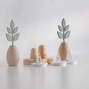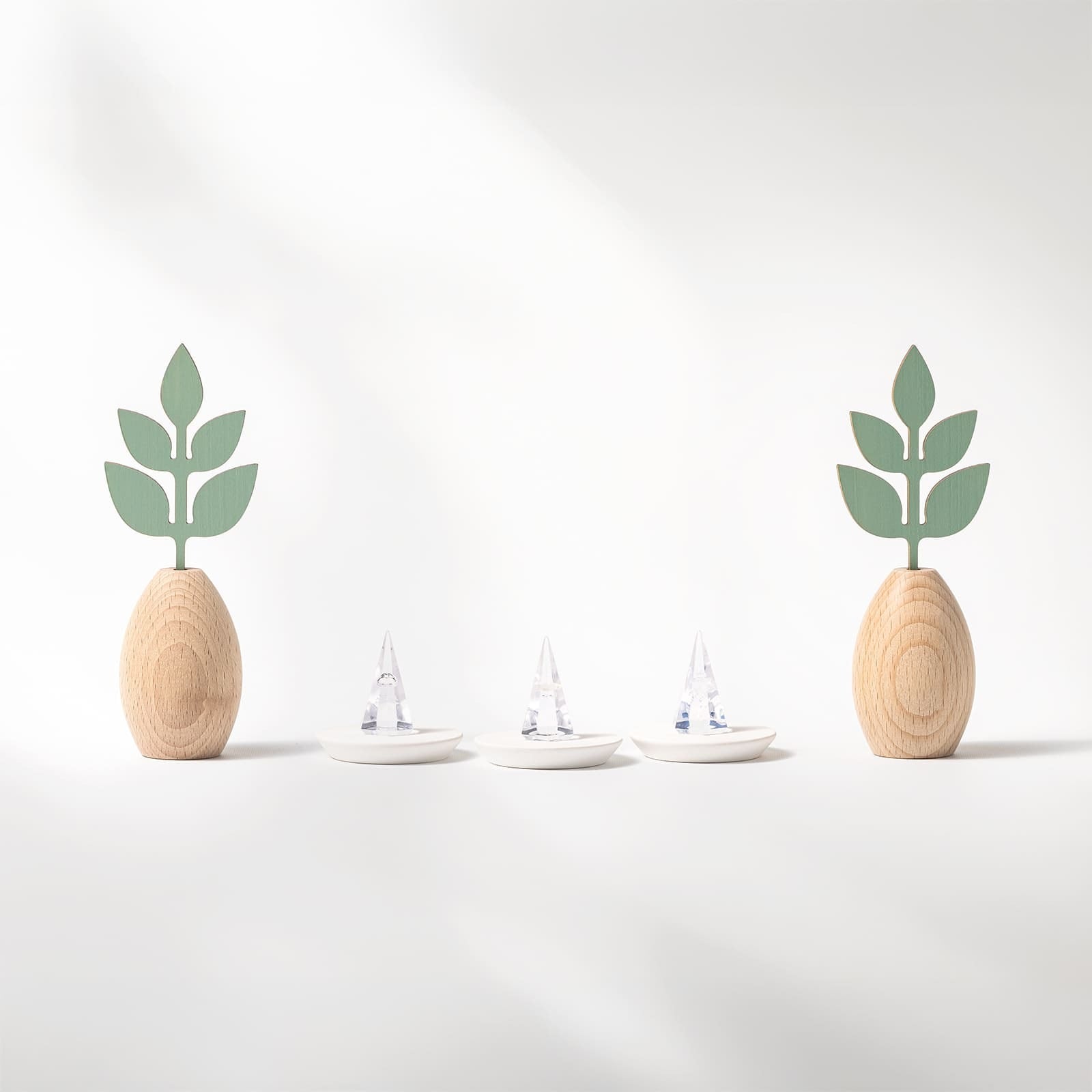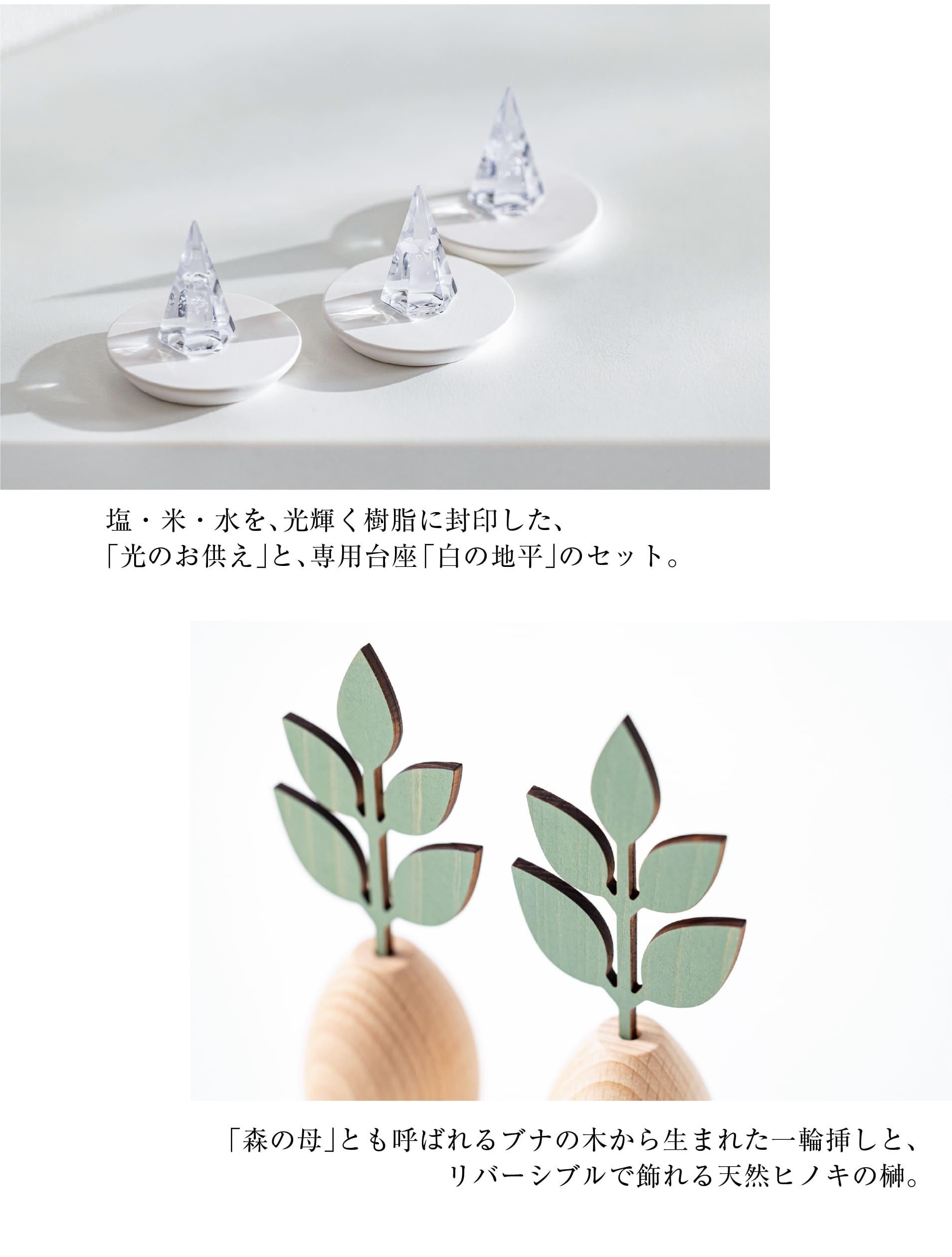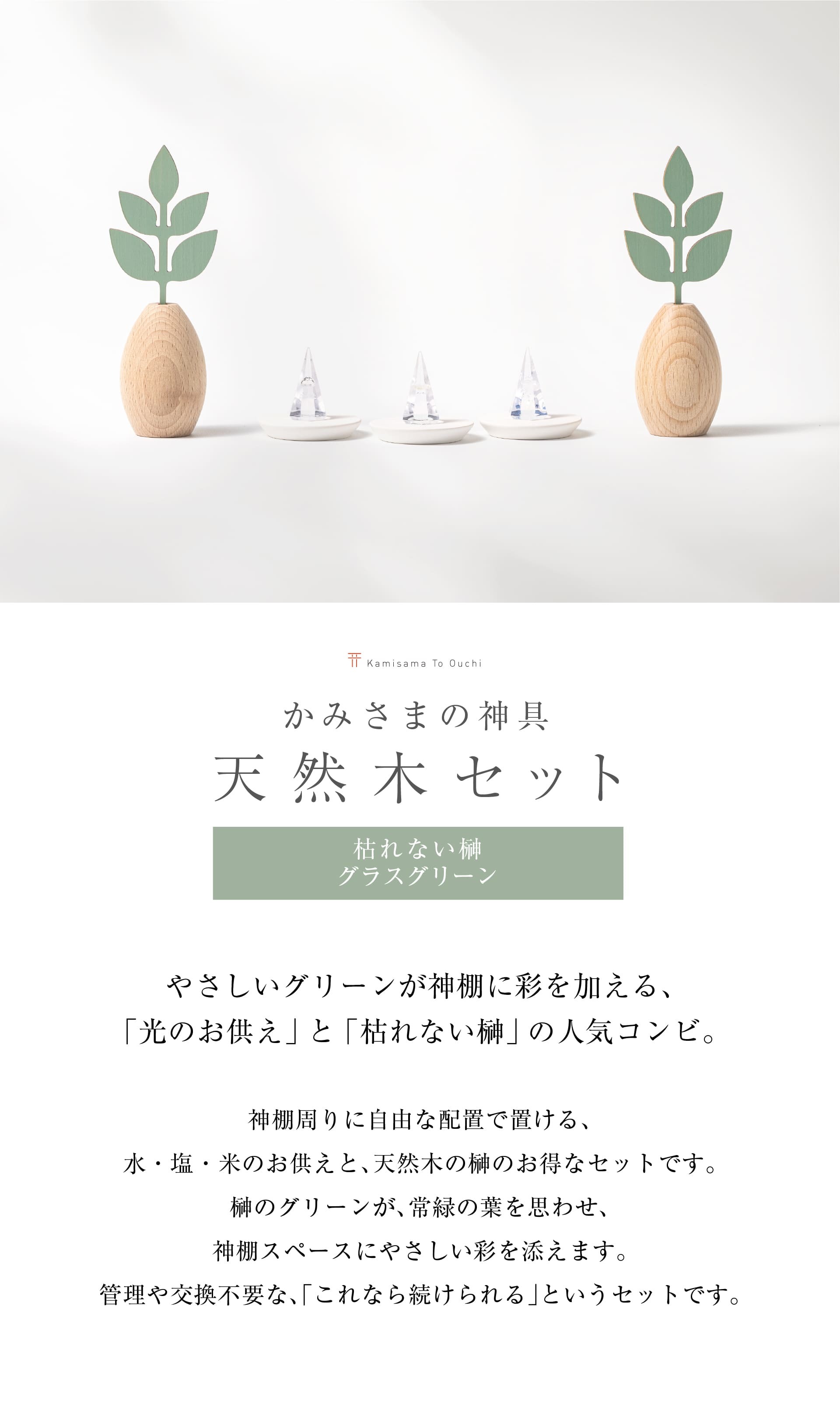 【 かみさまの神具 天然木セット 】枯れない榊 グラスグリーン & 光のお供え[水・塩・米]& 専用台座[地平]